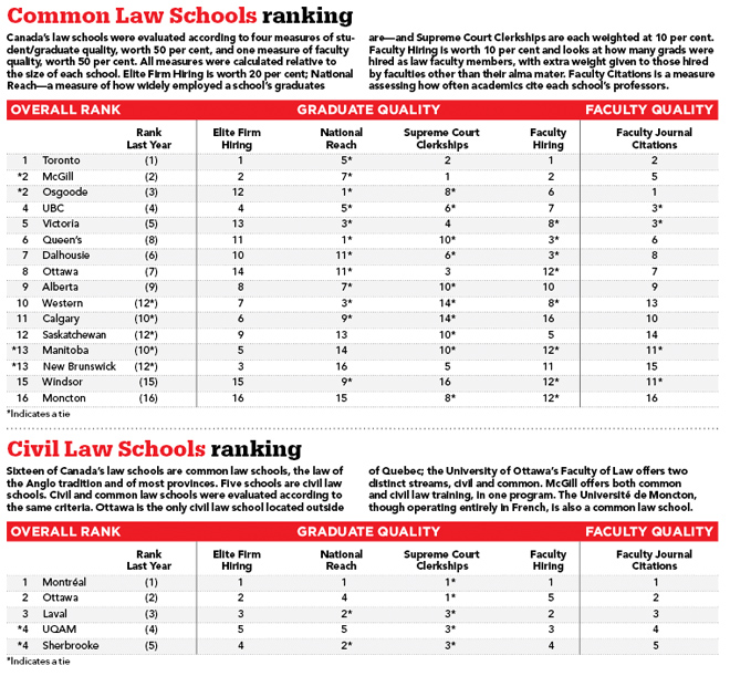 Every year Maclean’s publishes its ranking of top law schools in Canada. The ranking is split into common and civil law. Maclean’s bases its ranking based upon graduate and faculty quality.